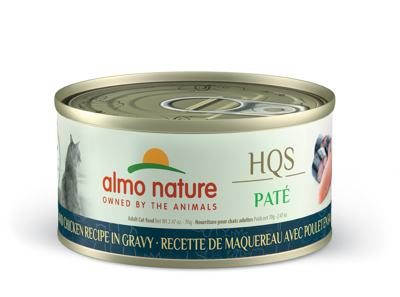 Almo Nature HQS Pate Mackerel and Chicken Recipe in Gravy Grain-Free Canned Cat Food delivers the simplicity and authenticity that cats adore: real, all-natural mackerel as the first ingredient along with chicken, cooked in minimal water to create a soft, tasty pate. Free of preservatives and rich in highly digestible proteins (min. 17%) and natural essential amino acids and micronutrients, it's great as a snack, treat or as part of a Rotational Diet. Keep finicky felines enticed by rotating between the wide array of flavorful HQS Natural & HQS Pate recipes! And you'll be happy to know that every healthy bite is crafted with HQS (High Quality Sourced) ingredients—meat and fish that was originally fit for human consumption and is now solely used for pet food to help nourish your furry friend!