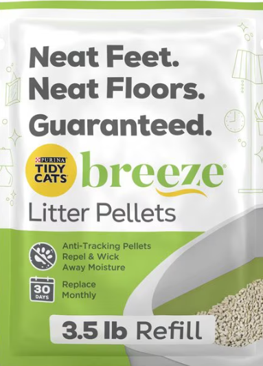 - A bag of mess-minimizing Breeze kitty litter box pellets lasts up to a month and offers a unique alternative to clay litter.