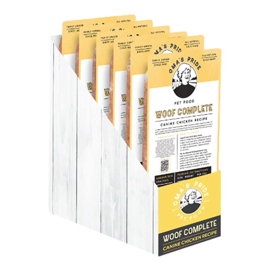 Woof Complete Canine Chicken Recipe is a complete raw meal formulated exclusively for dogs'. Made with USA-sourced and antibiotic-free chicken meat, organs, and bones blended with high quality vegetables and a specialty nutrient mix. Free of grains, corn, and other fillers for a naturally carnivore-focused canine diet. Quality you can trust for a healthy and happy pet!