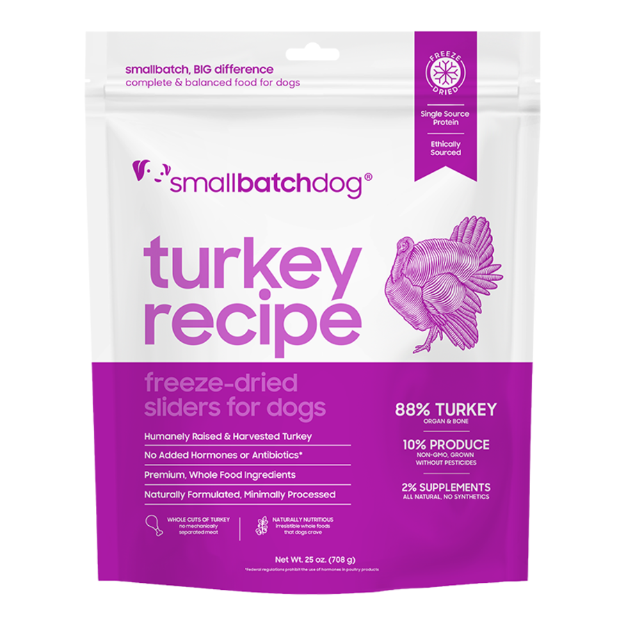 88% humanely raised and harvested turkey, 10% organic produce, 2% natural supplements