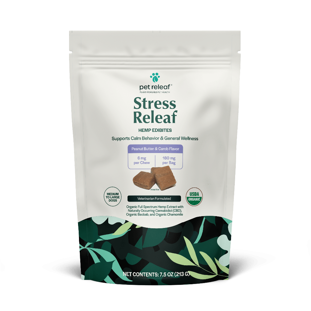 Pet Releaf’s CBD Chews for Dogs were created to support your dog’s overall wellness as well as specific health concerns. Along with CBD, our Calming Chews for Large Dogs were formulated with chamomile and baobab to further support their situational stress by promoting calming effect