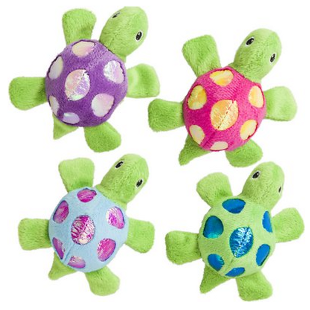 • Brightly-colored plush turtle toys feature fun shimmer accents that will catch your feline’s eye.