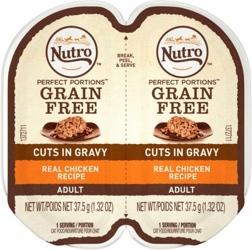 Give your adult cat delicious soft cat food without the mess of cans! This NUTRO Pate recipe features chicken as the #1 ingredient and is a natural cat food plus vitamins, minerals, and other nutrients. Unlike canned foods, each PERFECT PORTIONS tray has convenient snap-and-peel packaging with two individual servings for your cat and no messy leftovers! These NUTRO Wet Cat Food recipes are simple, purposeful, and trustworthy, and follow the NUTRO FEED CLEAN philosophy. They are made with non-GMO ingredients* carefully sourced from a trusted network of farmers and suppliers, and have no corn, wheat, or soy protein, no chicken by-product meal, and no artificial preservatives, flavors, or colors. Feed your cat a delicious soft cat food meal with NUTRO Adult Wet Cat Food Pate Trays. * Trace amounts of genetically modified material may be present due to potential cross-contact during manufacturing.