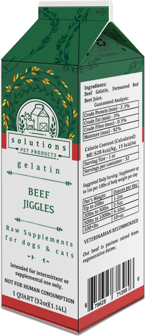 Solutions' gelatin is thick with natural collagen and elastin. Using their sustainably sourced gelatin supports the skin, coat, joint, nail and gut health of your pet.