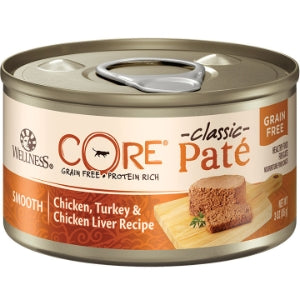 Wellness CORE is based on the nutritional philosophy that cats, given their primal ancestry, thrive on a diet mainly comprised of meat. Wellness CORE pate canned wet cat food naturally delivers the protein rich variety your cat craves from a robust selection of delicious recipes your cat is sure to love. Crafted by our team of pet nutritionists and veterinarians, each grain-free recipe features high-quality meat or seafood with the essential daily vitamins and minerals your cat needs to thrive. Wet cat food also provides the necessary daily hydration support to keep your cat happy and healthy. Wellness wet cat food does not contain any added carrageenan, wheat, wheat gluten, corn, soy, artificial colors, or preservatives.